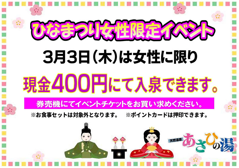 現金700円での入泉または大人のお食事セットを利用された女性のお客様に限り300円割引券1枚をプレゼントします。