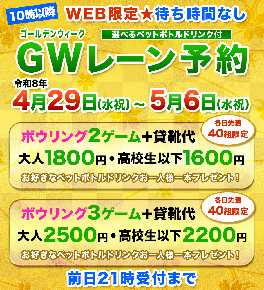 | WEB限定パック | ボウリング2ゲーム+貸靴代+お好きなペットボトルドリンクお一人様一本プレゼント 大人1800円・高校生以下1600円 |
