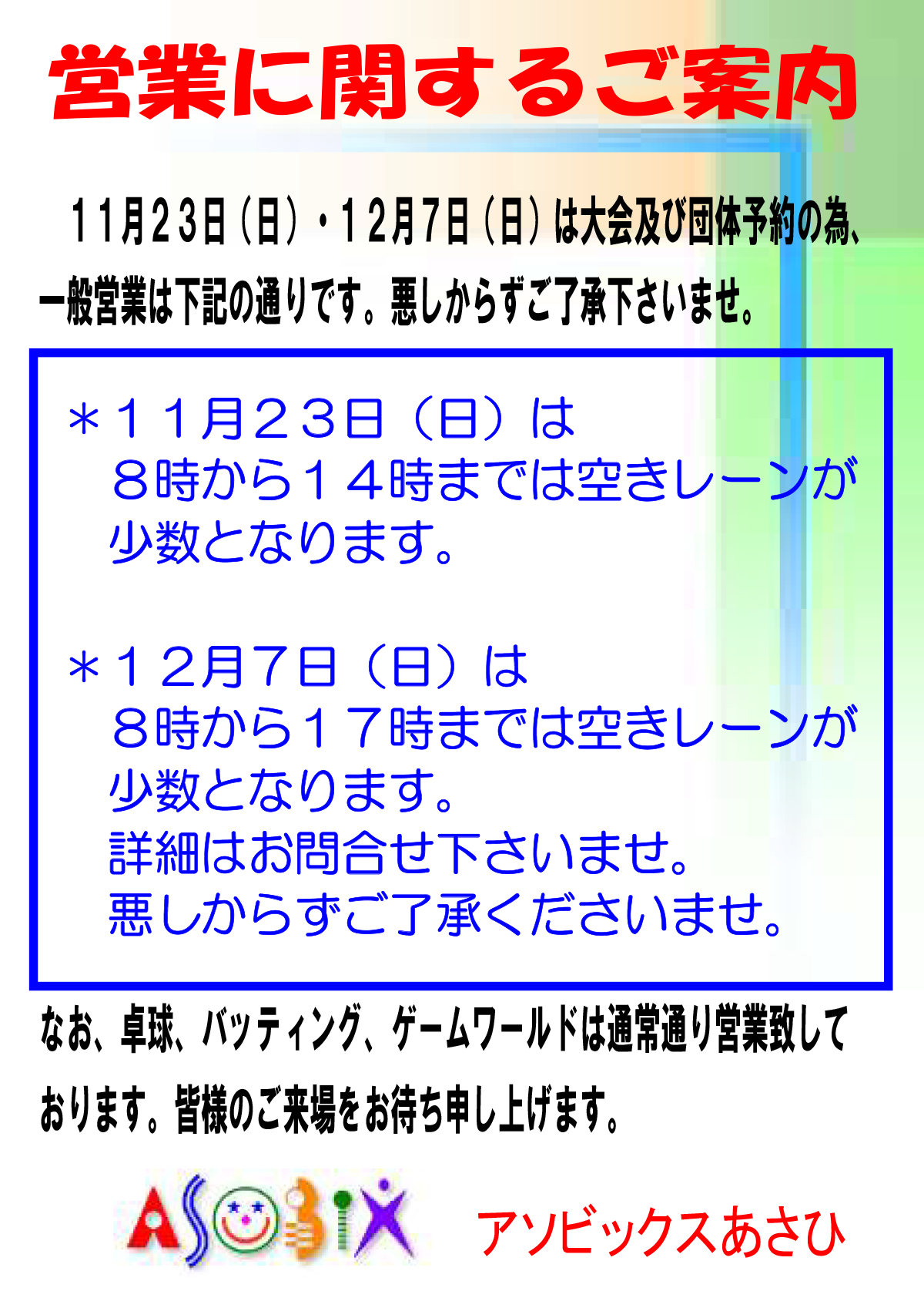 営業に関するご案内