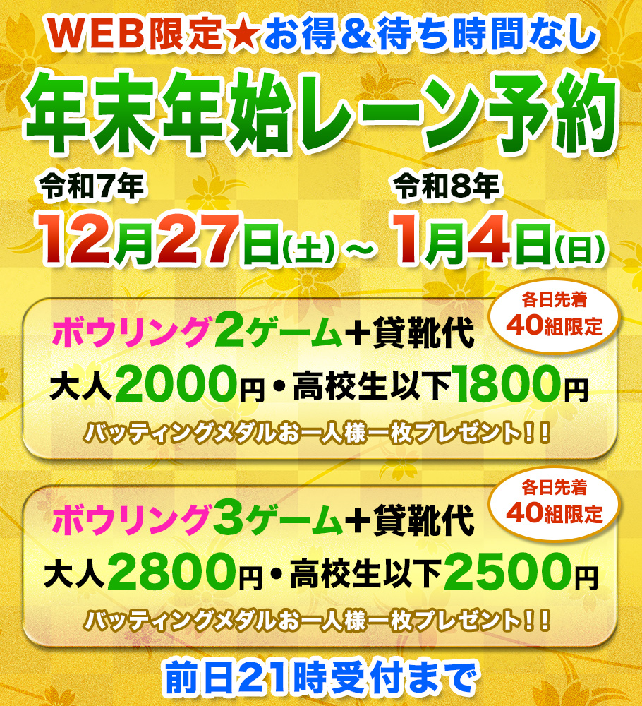 | 受付期間 | 予約日の前日21時まで受付可能 WEB限定割引のレーンがうまり次第、ご予約いただける時間帯が減っていきますのでお早めにご予約ください。 |